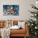 Step into a secret world where the magic of Christmas extends to every creature in the forest. “Santa’s Woodland Gift” captures a breathtakingly quiet moment amidst the busy holiday eve. Deep in the snowy woods, bathed in the soft blue light of the moon and the warm glow of a hanging lantern, Santa Claus takes a pause to share a meal with his forest friends.