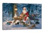 This artwork is a masterpiece of storytelling and atmosphere. The artist creates a stunning contrast between the cool, crisp winter night and the warmth emanating from Santa and his lantern. The details are exquisite, from the gentle trust of the fawn eating from Santa’s hand to the curious raccoons and attentive cardinals. It is a scene that celebrates kindness, peace, and the universal spirit of giving.