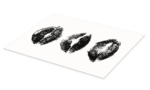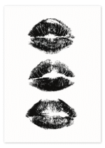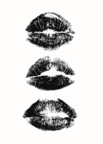 The beauty of this print lies in its raw simplicity. Three distinct lipstick imprints are rendered in a deep, textured black, allowing you to see the unique creases and lines of each one. Set against a clean white background, the high-contrast composition is direct, modern, and undeniably cool, celebrating a classic symbol of love and fashion.