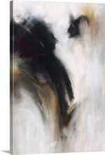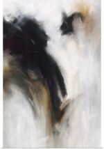 The artwork features a stunning interplay of light and dark. Sweeping, gestural strokes of charcoal and deep black cut across a soft, atmospheric background of white and grey. Subtle undertones of warm ochre and gold peek through the layers, adding warmth and complexity to the neutral palette. The result is a dynamic composition that feels alive and ever-changing.