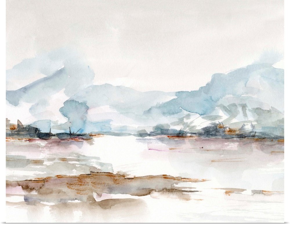 This artwork is a masterful example of the watercolor medium, where fluid brushstrokes and bleeding pigments create an organic and atmospheric effect. Muted washes of dusty blue and soft gray suggest a distant shoreline, while earthy browns and ochres ground the composition. The artist skillfully uses the white of the canvas to represent light and water, giving the piece a wonderfully light and airy presence.