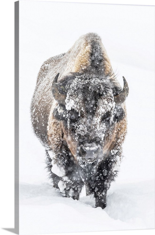 The minimalist aesthetic of this high-key photograph transforms a wildlife scene into a work of modern art. The bright white background acts as a perfect canvas, highlighting the rich, dark textures of the bison’s fur and the dusting of snow on its brow. It is a powerful visual metaphor for strength and endurance, delivered with elegant simplicity.