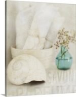 The photograph’s beauty lies in its soft-focus, ethereal quality, which gives it a timeless, painterly feel. A delicate still life of rolled towels, a weathered seashell, and a small vase of wildflowers is bathed in a soft, luminous light. The vintage texture and a muted palette of creamy whites, accented by a single splash of muted aqua, enhance the artwork’s calming and sophisticated character.
