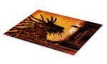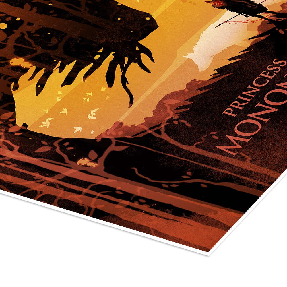 The design is a brilliant example of minimalist negative space. The majestic head of the Forest Spirit is not drawn with lines, but formed by the absence of the twisting tree branches, suggesting that the spirit is the forest. The warm, amber color palette bathes the scene in a twilight glow, while the small silhouettes of San and her wolf companion stand guard below, grounding the ethereal image in the film’s epic narrative.