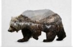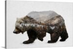 The artistry of the double exposure technique is executed with stunning elegance. The snowy, pine-covered slopes of a vast mountain range are seamlessly blended into the bear’s silhouette, with the texture of its fur merging into the trees and rocky crags. Set against a clean, minimalist background, this central image becomes an incredibly powerful and thought-provoking statement on the unity of all things wild.