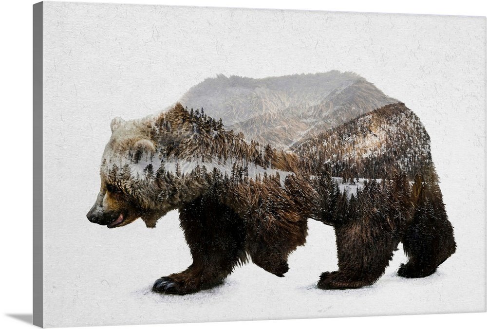 The artistry of the double exposure technique is executed with stunning elegance. The snowy, pine-covered slopes of a vast mountain range are seamlessly blended into the bear’s silhouette, with the texture of its fur merging into the trees and rocky crags. Set against a clean, minimalist background, this central image becomes an incredibly powerful and thought-provoking statement on the unity of all things wild.