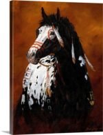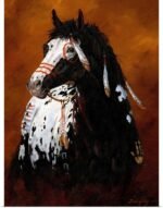 This is not just a portrait of a horse; it is a tribute to a noble companion and a powerful symbol of the warrior spirit of the American Plains. “Spirit Warrior” captures the pride, strength, and sacred bond between a Native American rider and their trusted steed. The horse stands as a living testament to a rich history, its gaze intelligent and soulful, embodying courage and resilience.