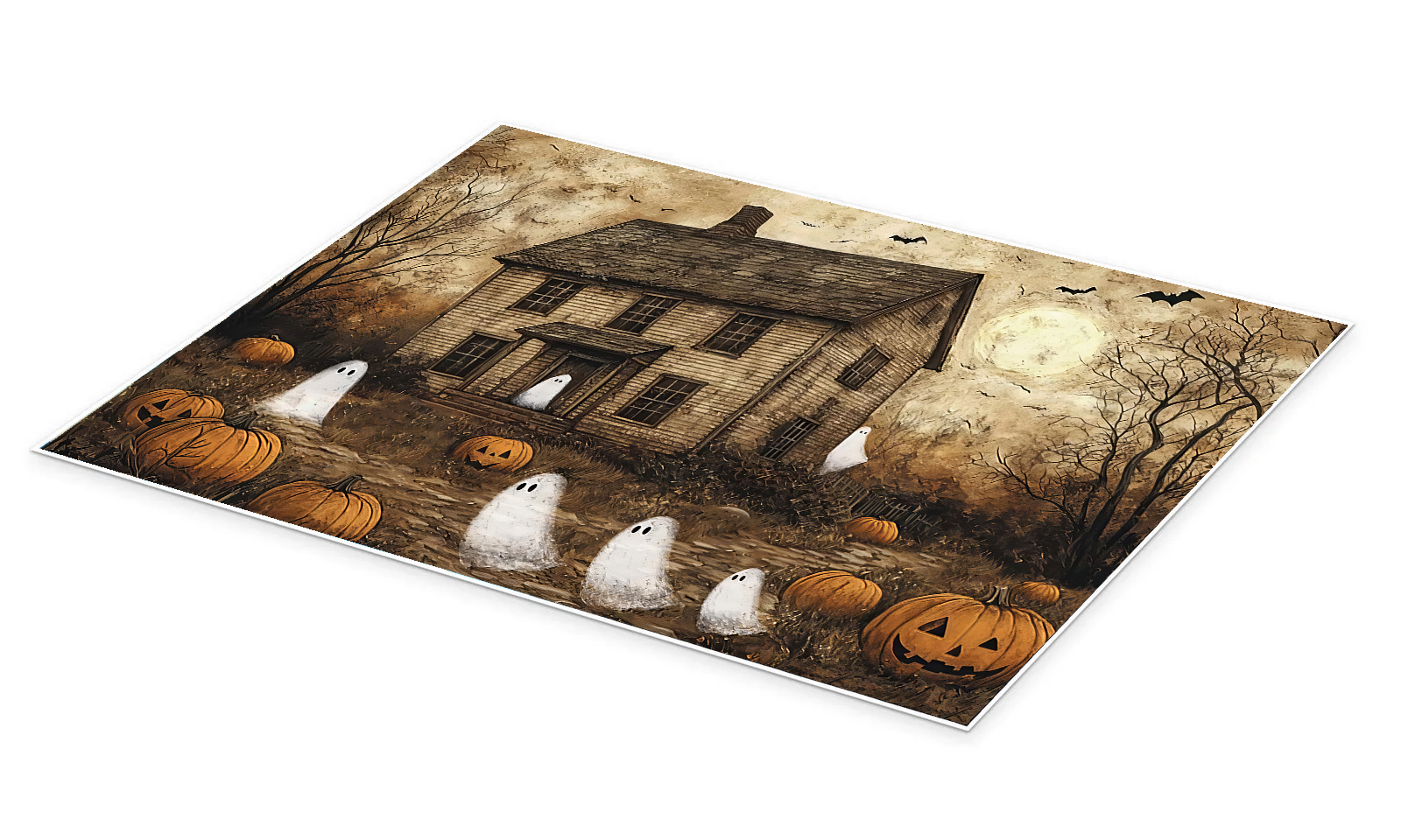 The piece is rendered in a gorgeous vintage style, with a textured, painterly finish and a muted color palette of sepia, parchment, and pumpkin orange. This gives it the timeless feel of a cherished illustration from a classic storybook. From the crooked shingles on the roof to the cheerful grins on the pumpkins and the simple, expressive eyes of the ghosts, every detail is designed to delight and evoke fond memories of crisp autumn nights.