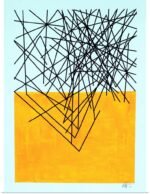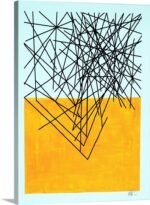 The composition is strikingly simple yet effective. A horizon line separates a cool, airy sky blue from a warm, grounding mustard yellow. Overlaid on this peaceful background is an explosion of sharp black lines—a tangled, architectural web that feels both random and deliberate. This juxtaposition creates a visual tension that is undeniably contemporary and chic.