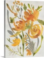 This piece is a beautiful example of modern watercolor artistry. The artist uses fluid, gestural brushstrokes to suggest the forms of petals and leaves, allowing the translucent layers of marigold, yellow, and sage green to blend and interact beautifully. The composition feels light and unburdened, set against a subtly textured background that adds a touch of rustic warmth.