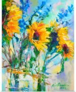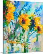 Immerse your space in an explosion of pure, unadulterated joy. “Sunburst Bouquet” is not merely a painting of flowers; it’s a celebration of life at its most vibrant. This artwork captures the radiant energy of sunflowers in full bloom, their sunny dispositions amplified by a chorus of brilliant blue blossoms. It’s a piece that sings with optimism and is guaranteed to bring a smile to your face.