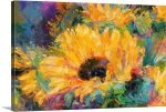 The artist’s technique is a dynamic display of expressionism, using a thick, impasto style where every brushstroke is a jolt of energy. Brilliant golden yellows dominate, forming the ecstatic petals of the sunflowers, while a riot of cool blues, deep purples, and fresh greens dance in the background, creating a stunning visual contrast. The thick, sculptural texture of the paint invites you to not just see the flowers, but to feel their vibrant life force.