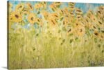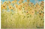 The artist’s delicate touch creates a scene full of light and movement. Soft, airy brushstrokes define the nodding heads of the sunflowers and the swaying grasses, blurring the lines between form and atmosphere. The fresh palette of lemon yellows, grassy greens, and sky blues is uplifting and serene, bringing the outdoors in with a sense of effortless grace.
