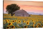 Let your mind wander to a warm, golden evening in the heart of the countryside. “Sunset Field of Gold” is a breathtaking escape, a perfect, idyllic moment captured in time. This photograph portrays a charming stone farmhouse nestled in a seemingly endless sea of sunflowers, all bathed in the soft, romantic glow of a pastel sunset. It’s a scene of pure, peaceful bliss.