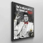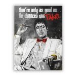 Channel the fearless ambition of a cinematic legend. This powerful artwork captures the iconic Tony Montana at the height of his power, a symbol of relentless drive and the will to seize every opportunity. Paired with the unforgettable philosophy, “You’re only as good as the chances you take,” this piece is a raw and stylish tribute to the mindset that builds empires.