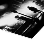 This artwork is a stunning example of cinematic photography as high art. The masterly use of high-contrast black and white and the atmospheric fog creates a world of deep shadow and piercing light. The solitary figure, dwarfed by the house and the darkness, becomes a powerful symbol of courage in the face of overwhelming dread. It’s an image that tells its terrifying story through what it doesn’t show.
