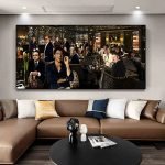 This masterfully crafted digital collage brings together a pantheon of cinematic legends in a single, impossibly cool scene. The artist has created a sophisticated, moody atmosphere, bathing the luxurious, modern lounge in a warm, low light that feels both intimate and intimidating. It’s a rich, detailed world where every corner holds another famous face, inviting you to discover new interactions with every viewing.