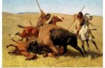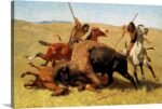 The artist masterfully renders the chaotic energy of the scene. The straining muscles of the horses, the determined focus of the hunters, and the massive, unstoppable power of the bison are brought to life with realistic detail. The sun-bleached colors of the prairie grass and the pale sky create an authentic backdrop for this dramatic struggle, making you feel the heat and the urgency of the moment.