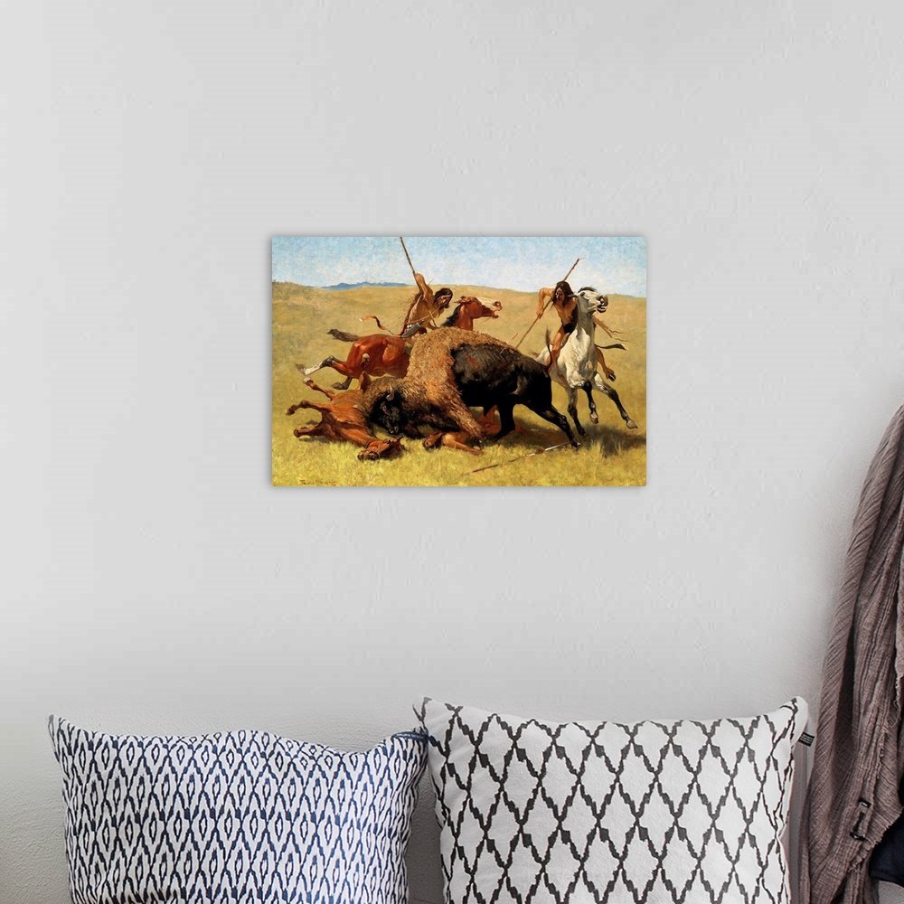 The artist masterfully renders the chaotic energy of the scene. The straining muscles of the horses, the determined focus of the hunters, and the massive, unstoppable power of the bison are brought to life with realistic detail. The sun-bleached colors of the prairie grass and the pale sky create an authentic backdrop for this dramatic struggle, making you feel the heat and the urgency of the moment.