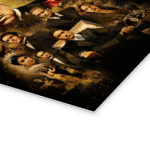 The design is a masterclass in visual storytelling. Rendered in a rich, painterly style with a sophisticated golden patina, the montage weaves together the film’s most pivotal characters and moments. Don Vito looms large, the patriarch whose influence is inescapable, while Michael sits at the center, the reluctant prince who becomes a ruthless king. This is a piece of art that commands respect, just like the family it portrays.