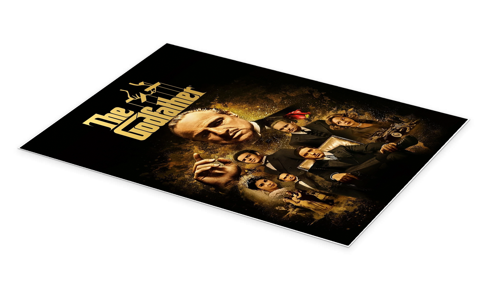 The design is a masterclass in visual storytelling. Rendered in a rich, painterly style with a sophisticated golden patina, the montage weaves together the film’s most pivotal characters and moments. Don Vito looms large, the patriarch whose influence is inescapable, while Michael sits at the center, the reluctant prince who becomes a ruthless king. This is a piece of art that commands respect, just like the family it portrays.