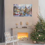 Immerse yourself in the hustle and bustle of a classic holiday season. “The Festive Village Square” is a panoramic celebration of community and Christmas spirit, capturing a charming town at the height of its festivities. From the horse-drawn sleigh gliding over the snow to the carolers gathering by the tree, this artwork is a tapestry of joyful moments that evokes the nostalgia of a traditional winter.