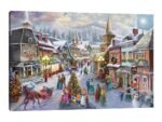 The painting is rich with storytelling details and vibrant life. The artist uses a masterful interplay of light and shadow, where the cool, snowy blue of the winter evening is punctuated by the glowing warmth of streetlamps and shop windows. The colorful coats of the villagers and the festive decorations add a lively rhythm to the scene, inviting you to step right into the picture and join the celebration.