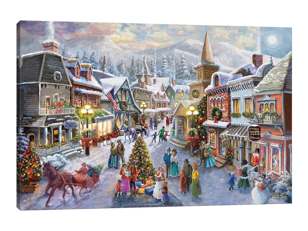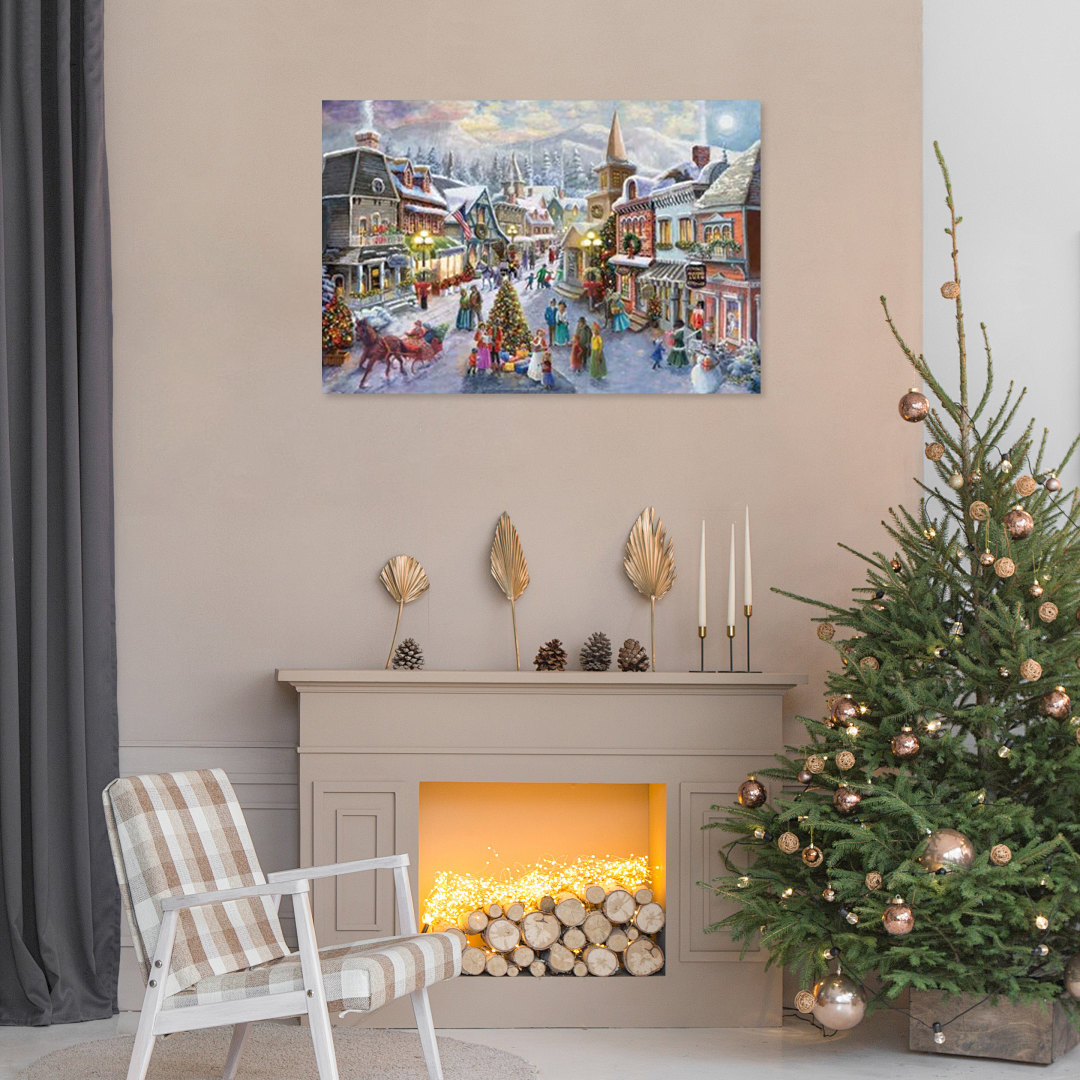 The painting is rich with storytelling details and vibrant life. The artist uses a masterful interplay of light and shadow, where the cool, snowy blue of the winter evening is punctuated by the glowing warmth of streetlamps and shop windows. The colorful coats of the villagers and the festive decorations add a lively rhythm to the scene, inviting you to step right into the picture and join the celebration.