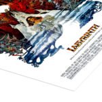 The poster is a masterpiece of vintage fantasy illustration. The rich, painted style captures the whimsical yet slightly dark atmosphere of the film perfectly. From the intricate details of the goblins hiding in the shadows to the symbolic contrast between Jareth’s fiery domain and Sarah’s innocent resolve, every inch of this print tells a story of adventure and coming of age.
