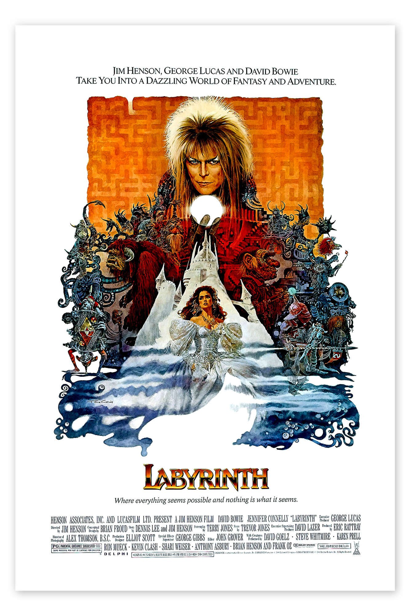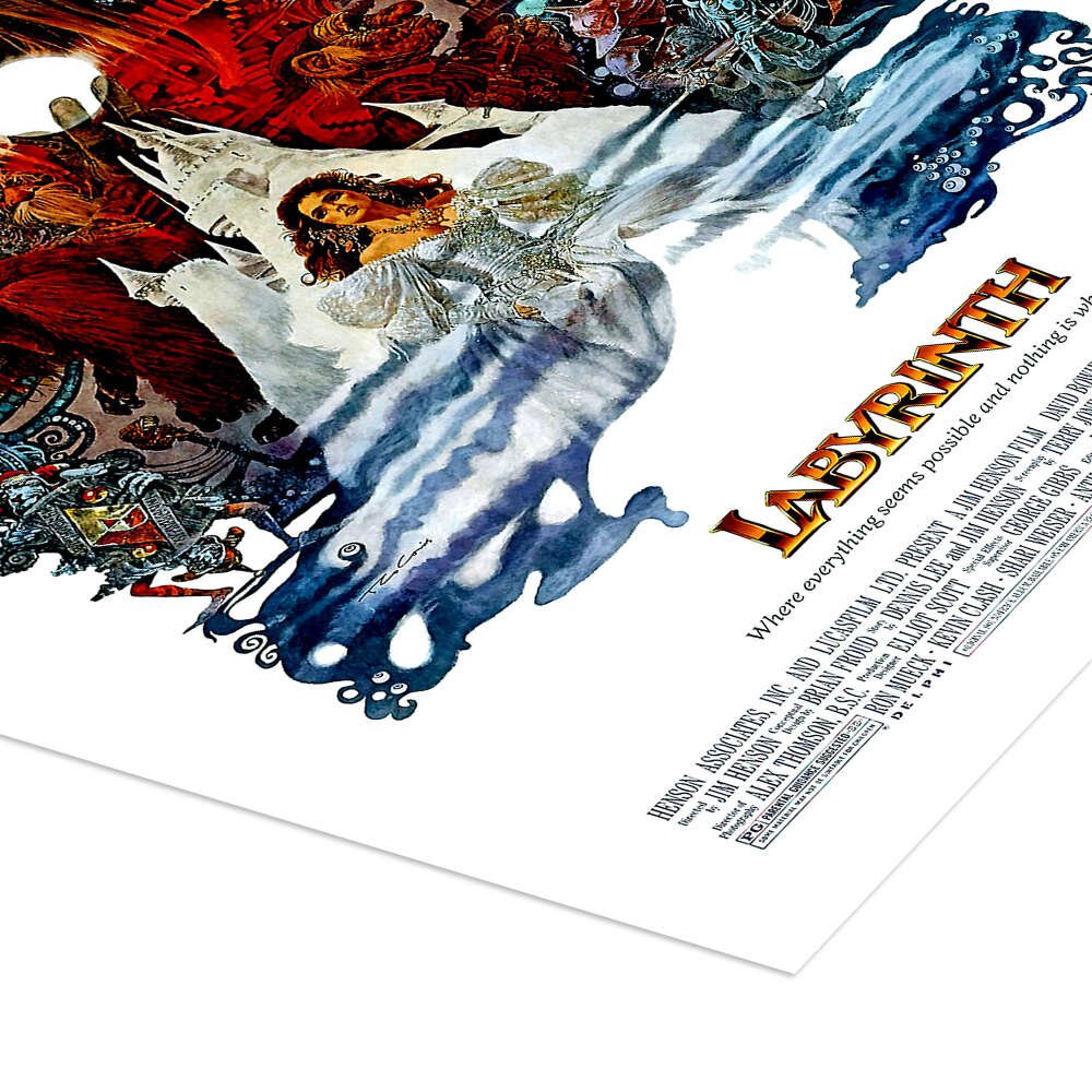The poster is a masterpiece of vintage fantasy illustration. The rich, painted style captures the whimsical yet slightly dark atmosphere of the film perfectly. From the intricate details of the goblins hiding in the shadows to the symbolic contrast between Jareth’s fiery domain and Sarah’s innocent resolve, every inch of this print tells a story of adventure and coming of age.
