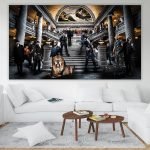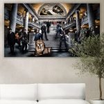 This is a masterwork of digital collage, skillfully blending dozens of iconic figures into a single, cohesive, and epic scene. See the cool calculation of James Bond, the anarchic chaos of The Joker, the raw power of The Rock, and the lightning-fast readiness of Bruce Lee, all sharing the same marbled floor. Presiding over them all is a roaring lion, a symbol of pure strength, under the watchful gaze of Michelangelo’s “The Creation of Adam”—a nod to the birth of greatness itself.