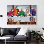 This digital collage is a treasure trove for any true fan, rich with detail and dark humor. The traditional supper table is replaced with a feast of mayhem: a burning pile of money, weapons, a duffel bag overflowing with cash, and even Batman’s captured cowl. Each Joker brings their unique brand of madness to the table, creating a dynamic and endlessly fascinating narrative that parodies classical art with pop culture genius.