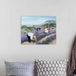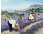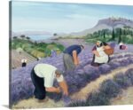 The artist’s endearing, folksy style gives this piece its unique warmth and character. The robust, hardworking figures are painted with a gentle simplicity, while the landscape unfolds in soft, harmonious colors. From the rhythmic rows of purple lavender to the distant, peaceful sea and the ancient village perched on the hill, every element combines to create a scene of pure, bucolic bliss.