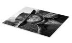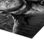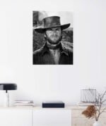 This piece is a masterclass in black and white photography. The high-contrast lighting carves out every detail with stunning clarity, from the weathered leather of the hat to the rough texture of the poncho. The sharp focus on Eastwood’s intense, squinting eyes creates an immediate and powerful connection, drawing you into the dusty, dangerous world of one of cinema’s greatest adventures.