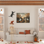 Add a touch of storybook magic to your Halloween decorations with this captivating canvas painting. It’s an ideal centerpiece for your living room, entryway, or any space where you want to create a festive and inviting atmosphere. Far from frightening, this piece is a joyful celebration of community and spooky fun that will be a beloved part of your family’s holiday traditions.