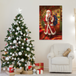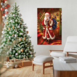 Shh… the magic is happening! “The Quiet Arrival” brings the enchanting secret of Christmas Eve right into your living room. This stunning artwork captures the classic Old World Santa Claus in a moment of conspiratorial joy, holding a finger to his lips as if to say, “Don’t wake the children,” while he prepares to leave gifts from his overflowing sack.