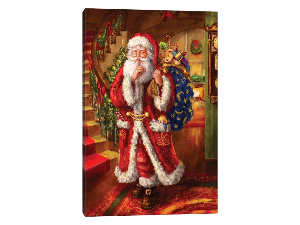 Shh… the magic is happening! “The Quiet Arrival” brings the enchanting secret of Christmas Eve right into your living room. This stunning artwork captures the classic Old World Santa Claus in a moment of conspiratorial joy, holding a finger to his lips as if to say, “Don’t wake the children,” while he prepares to leave gifts from his overflowing sack.