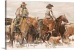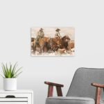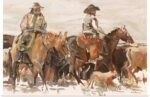 This artwork is a tribute to the unyielding spirit of the American cowboy, a raw and honest depiction of a hard day’s work on the open range. “The Winter Drive” captures the grit and determination of two riders as they push onward through the cold, their forms blurred by motion and the harsh elements. It’s a piece that doesn’t romanticize the West, but rather celebrates its authentic, rugged soul.