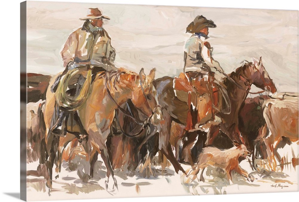 This artwork is a tribute to the unyielding spirit of the American cowboy, a raw and honest depiction of a hard day’s work on the open range. “The Winter Drive” captures the grit and determination of two riders as they push onward through the cold, their forms blurred by motion and the harsh elements. It’s a piece that doesn’t romanticize the West, but rather celebrates its authentic, rugged soul.
