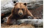 This piece is a stunning example of wildlife photography at its most intimate. The incredible, high-resolution detail allows you to see the texture of every strand of the bear’s thick, brown fur and the weathered grain of the fallen logs that frame it. The natural lighting creates a lifelike presence, making you feel as though you are truly sharing a moment of mutual respect with this magnificent animal.