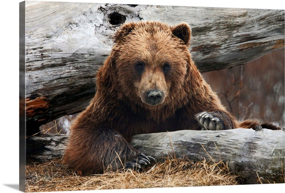This piece is a stunning example of wildlife photography at its most intimate. The incredible, high-resolution detail allows you to see the texture of every strand of the bear’s thick, brown fur and the weathered grain of the fallen logs that frame it. The natural lighting creates a lifelike presence, making you feel as though you are truly sharing a moment of mutual respect with this magnificent animal.