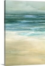 The artist’s fluid watercolor technique creates a sense of effortless movement and tranquility. Soft washes of warm beige bleed into layers of seafoam green and slate blue, mimicking the rhythmic ebb and flow of the tide. The misty, undefined horizon invites the mind to wander and rest, making this piece a true sanctuary for the eyes.