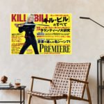 The design brilliantly mimics the high-energy aesthetic of Japanese magazines. The iconic yellow and black color scheme provides a powerful backdrop for a battle-ready Uma Thurman. The dynamic layout, packed with bold Katakana and Kanji, creates a sense of excitement and authenticity that transports you straight to a newsstand in Shibuya at the time of the film’s premiere.