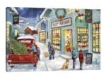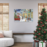 The artwork is rich with storytelling details, from the “Doll Shop” sign swinging in the winter breeze to the faithful dog watching the festivities. The artist uses a beautiful contrast of cool, snowy blues and warm, inviting ambers to create a cozy atmosphere that feels like a warm hug. It’s a snapshot of a simpler time, filled with anticipation and community spirit.