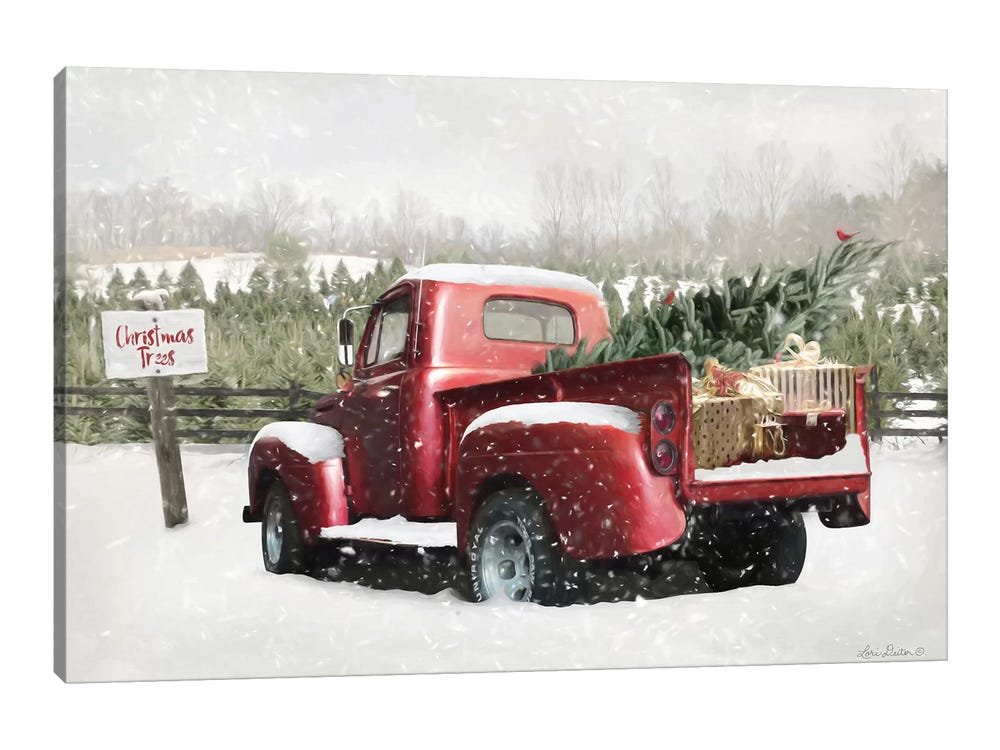 This artwork is steeped in rustic nostalgia. The vibrant red of the truck pops beautifully against the soft, snowy landscape, creating a focal point that is both bold and welcoming. Delightful details, like the hand-painted “Christmas Trees” sign and the little red cardinal perched on the greens, add layers of charm and storytelling to the composition. It’s a snapshot of a perfect winter day spent making memories.