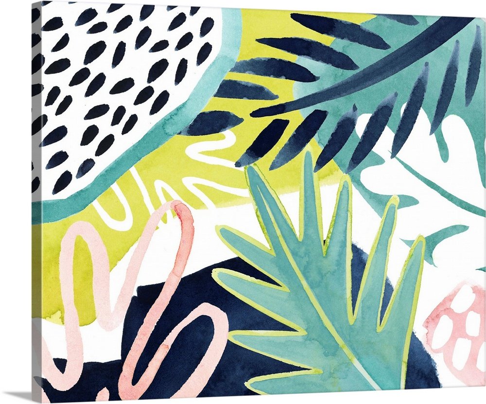 The artist uses a vibrant mix of watercolor and gouache textures to bring this composition to life. Bold, graphic representations of palm leaves in teal and navy contrast with the organic, speckled patterns of dragon fruit and lime-green washes. Hints of soft pink squiggles add a touch of whimsy, creating a balanced yet energetic visual experience that feels fresh and contemporary.