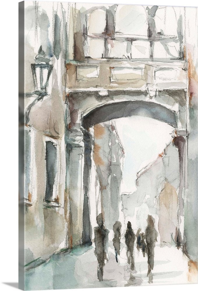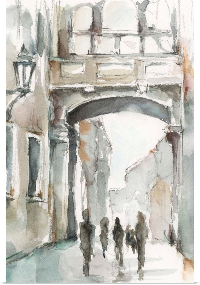 The artist employs a loose, impressionistic style, using washes of warm grey, beige, and slate blue to suggest the architecture without rigid definition. The silhouetted figures add a sense of life and scale, walking towards a light-filled opening that invites the viewer to follow. The neutral color palette is incredibly sophisticated, allowing the piece to blend seamlessly with modern, traditional, or transitional decor.