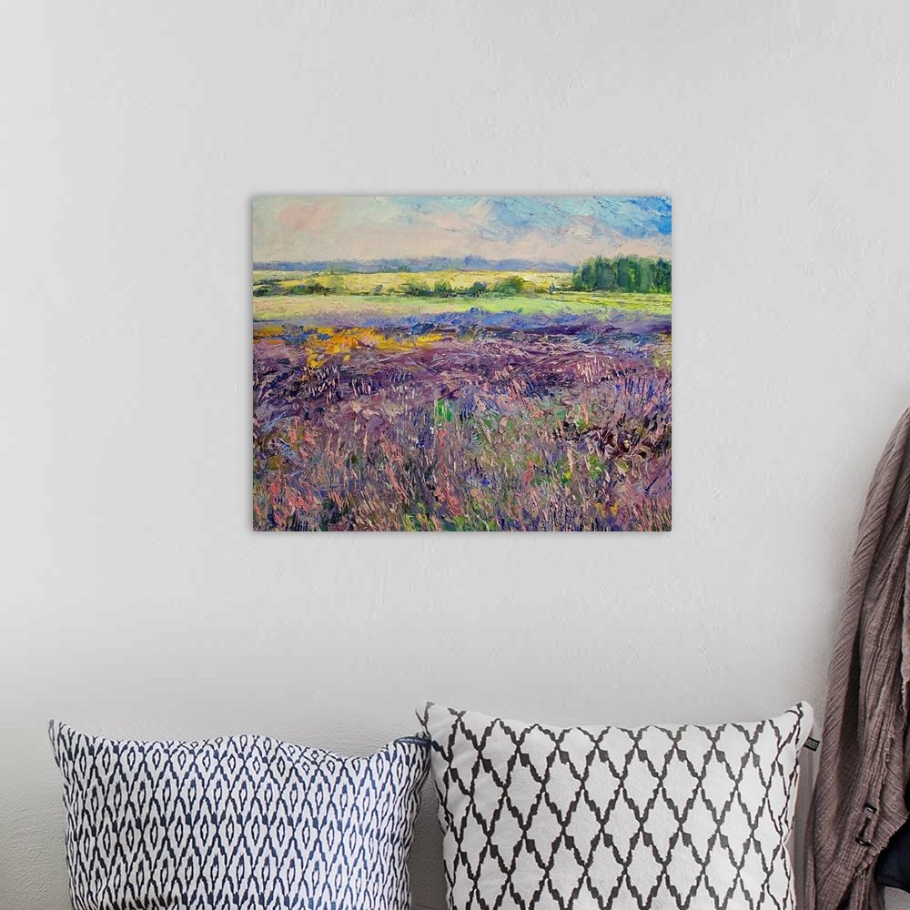 The artist’s technique is bold and expressive, using short, thick brushstrokes to build a rich tapestry of color. The deep, moody violets and mauves of the foreground provide a stunning contrast to the bright, sunny yellows of the mid-ground, creating a visual vibration that makes the scene feel dynamic and energized. It is a painting that celebrates the raw, sensory experience of being outdoors.