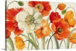 The artist uses a rich, painterly style to bring out the personality of each flower. Bold hues of scarlet red and tangerine orange dance alongside a central, creamy white bloom, creating a stunning visual balance. The soft, fluid brushstrokes on the petals and the gentle green of the stems give the piece a relaxed, farmhouse appeal that is both elegant and unpretentious.