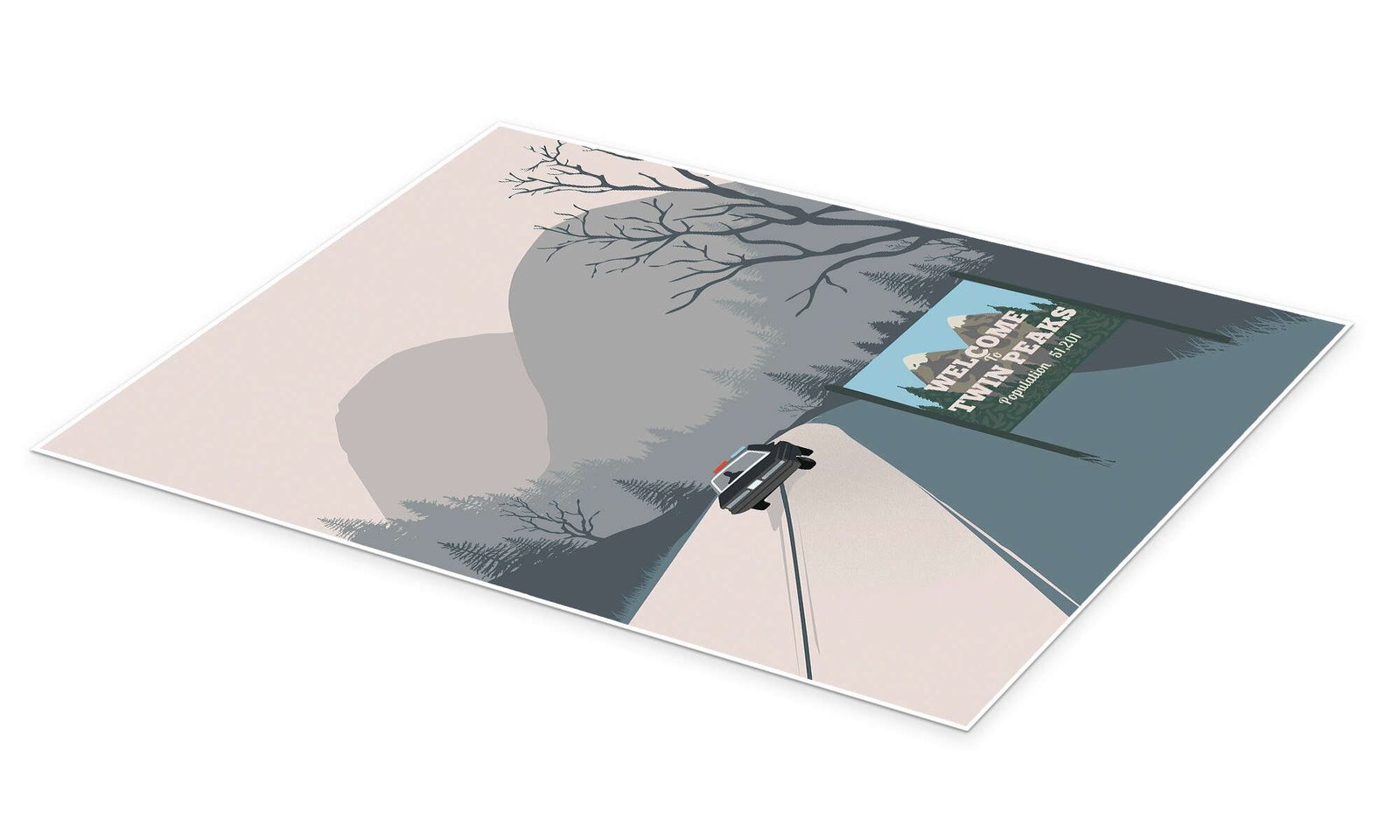 The design is a masterclass in modern, minimalist illustration. The artist uses a muted, foggy color palette and clean, flat shapes to create a powerful sense of mood and atmosphere. The composition is a direct homage to the show’s opening credits, making the viewer feel as though they are driving into town for the very first time, ready to uncover its secrets.